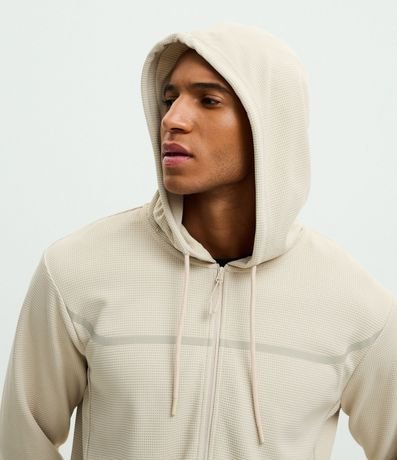 Ref: Casaco esportivo, texturizado, com tape refletivo no peito, gola com capuz e cordão, bolsos com zíper e fechamento frontal por zíper.