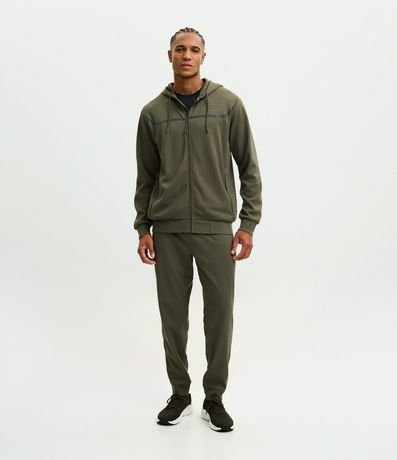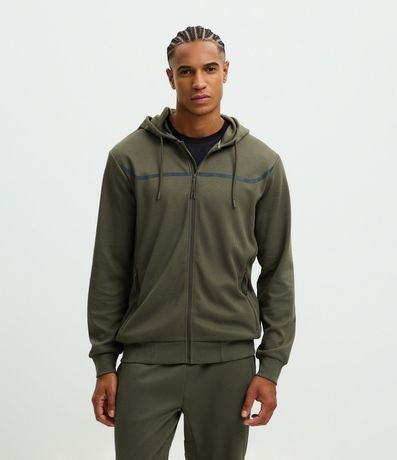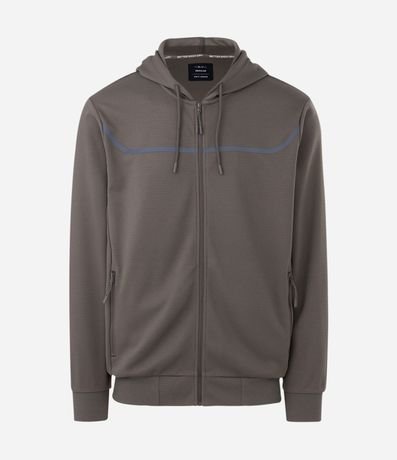 Ref: Casaco esportivo, texturizado, com tape refletivo no peito, gola com capuz e cordão, bolsos com zíper e fechamento frontal por zíper.