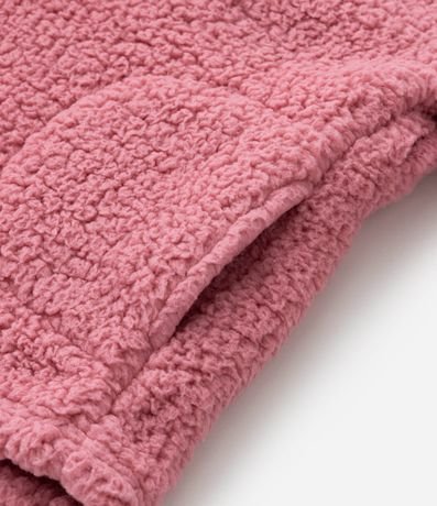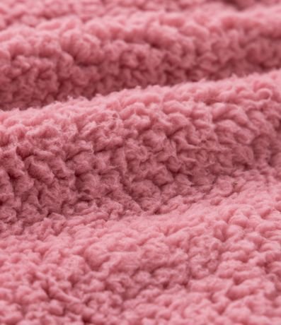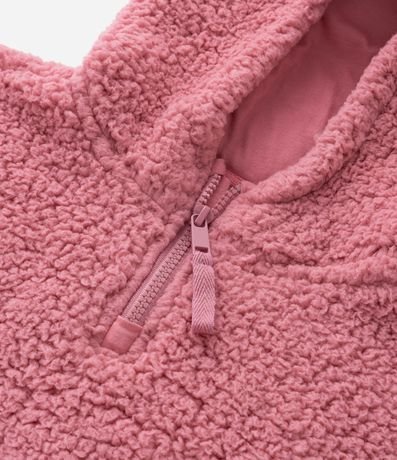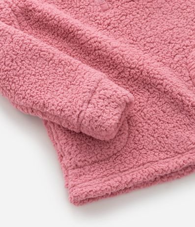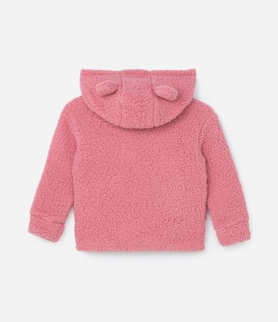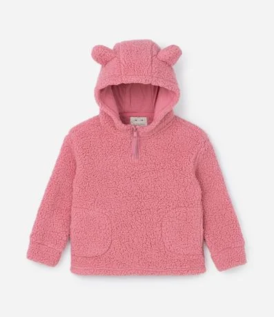 Ref: Casaco infantil de modelo fechado, quentinho, confeccionado em sherpa e com capuz de orelhinhas. Sem estampa, possui bolsos e abertura curta com zíper na gola.