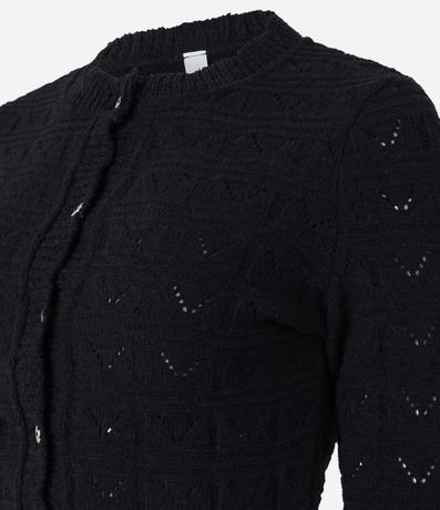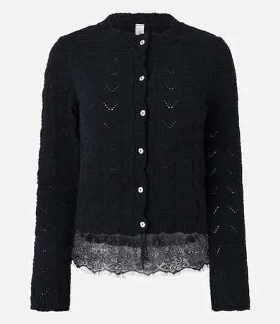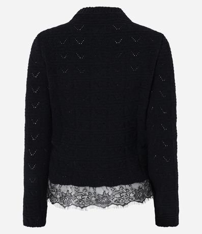 Ref: Casaco feminino confeccionado em tricô leve de poliéster, com acabamento liso em ponto aberto que confere delicadeza e leve transparência ao visual, apresentando manga longa, gola redonda e fechamento frontal por botões, além de detalhe em renda aplicada na barra que adiciona feminilidade e sofisticação, ideal para composições elegantes e versáteis no dia a dia.