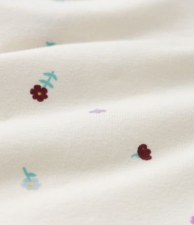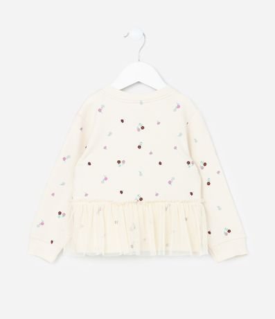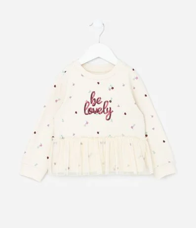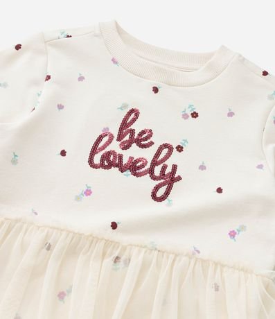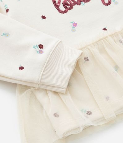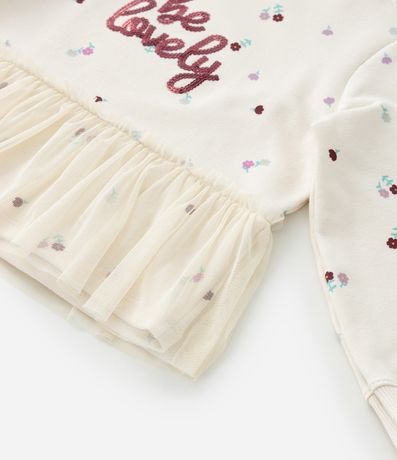 Casaco infantil de modelo fechado, confeccionado em moletom sem forro, com gola redonda, mangas longas, babadinho em tule na barra e bordadinho "Be lovely" em paetês no peito. Possui estampa de fundo de mini florzinhas.