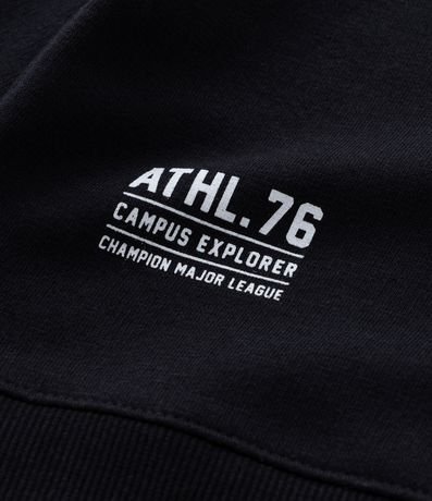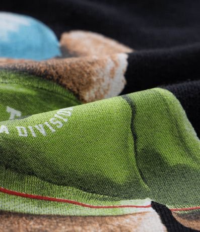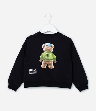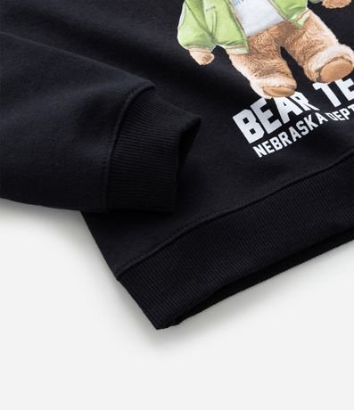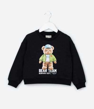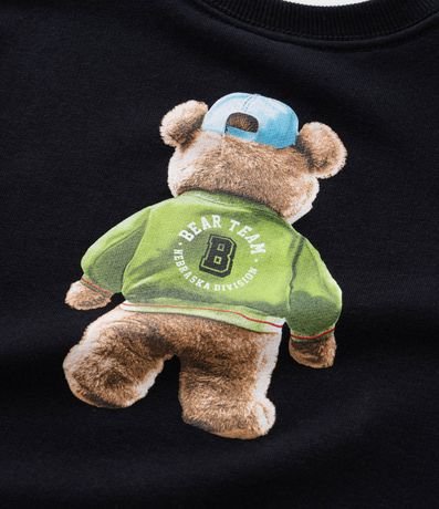 Casaco infantil de modelo fechado, com gola redonda, manga longa e com estampa frente e costas de ursinho com lettering "Bear Team". A peça é confeccionada com boas práticas ambientais e algodão certificado bci.