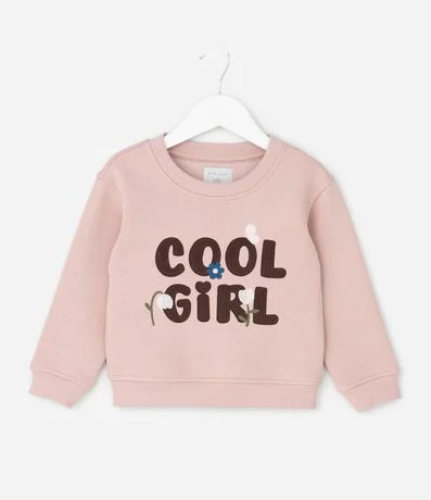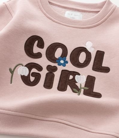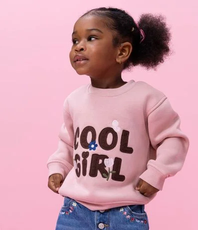 Casaco infantil modelo comfort confeccionado em moletom com felpa. Possui gola redonda, mangas longas e lettering bordado com aplicações florais, criando visual moderno e delicado para compor combinações casuais aconchegantes ao longo da rotina das pequenas.