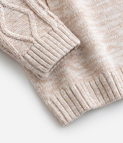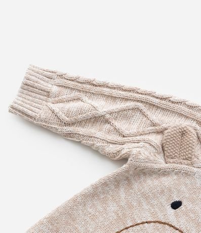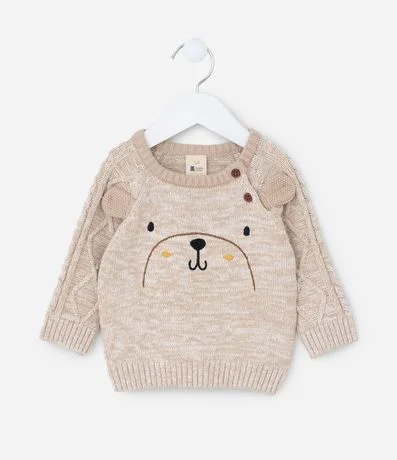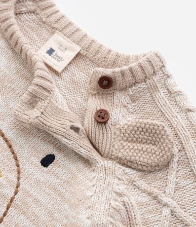 Ref: Casaco infantil confeccionado em tricô pesado com trama rica e mangas em jacquard texturizado. Possui bordado frontal de urso com orelhas aplicadas, gola redonda e abertura lateral por botões para facilitar o vestir. Confeccionado em algodão certificado BCI.