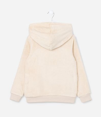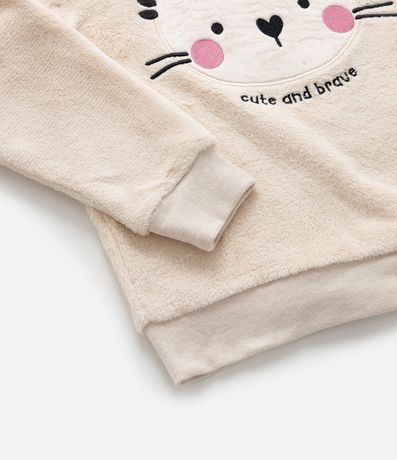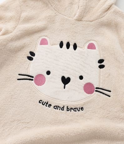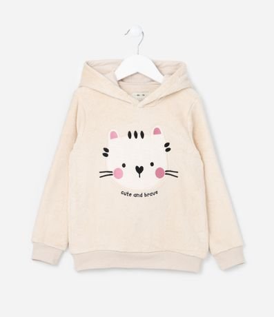 Casaco infantil de modelo fechado, confeccionado em fleece quentinho e peluciado, possui gola com capuz, mangas longas e bordado com cara de gatinho.