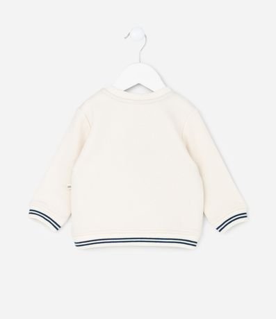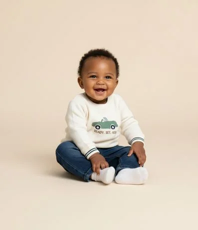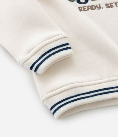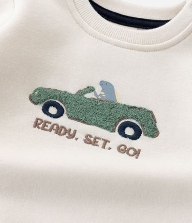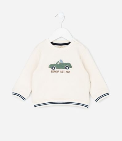 Casaco infantil confeccionado em moletom felpado com gola redonda e mangas longas. Possui abertura no ombro por botões de pressão, barrado e punhos com listras aplicadas e bordado localizado de carro em chenille, garantindo estrutura aconchegante para os dias frios.