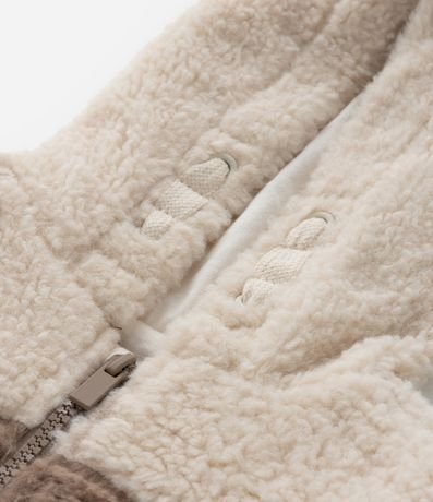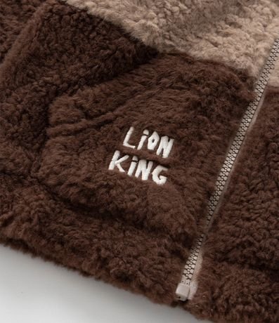 Casaco infantil confeccionado em sherpa, material quentinho e ideal para os dias frios! Possui gola com capuz, bolsos, recortes contrastantes, bordado do Simba no peito e fechamento por zíper.