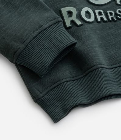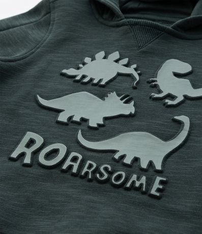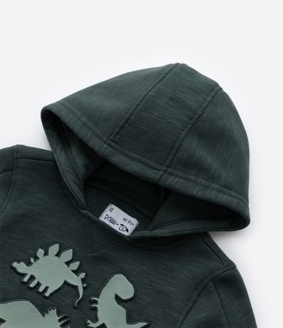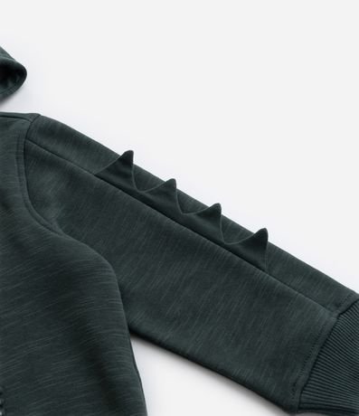 Casaco infantil confeccionado em moletom com forro quentinho, gola com capuz e estampa de dinossauros, com detalhes de crista interativa 3D na manga.