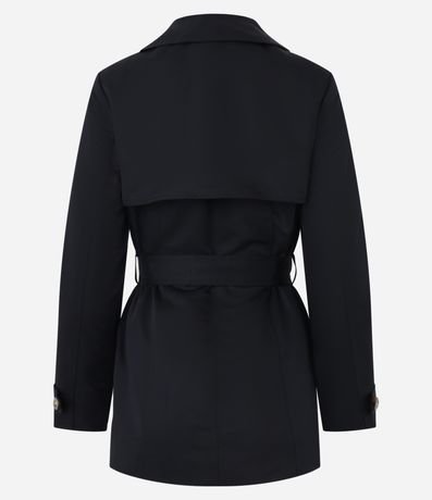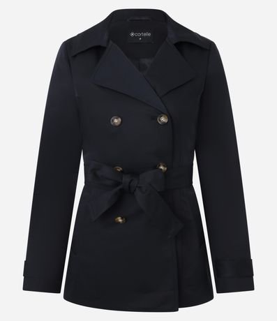 Ref: Casaco feminino de modelo trench coat, confeccionado em poliéster e com detalhes acetinados. Possui fechamento frontal com 06 botões matizados e amarração com faixa pespontada.