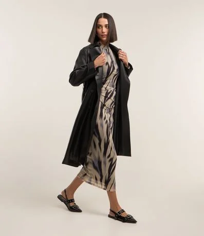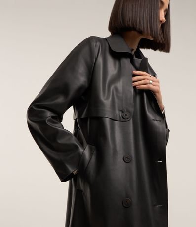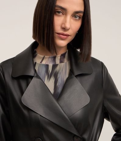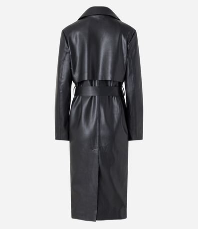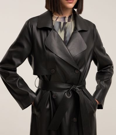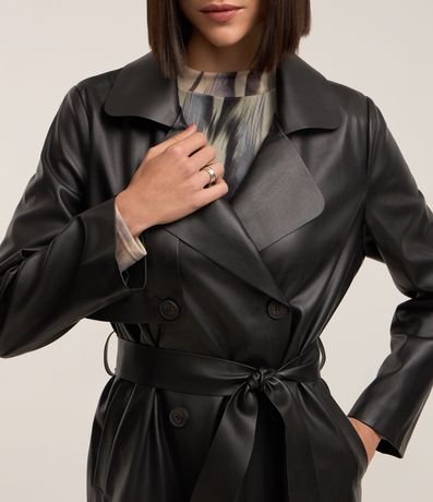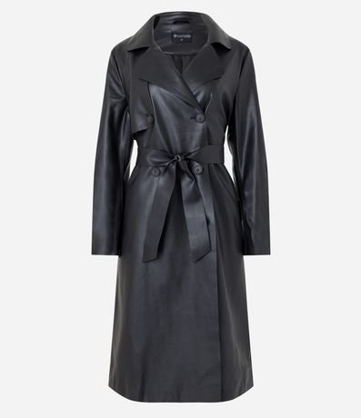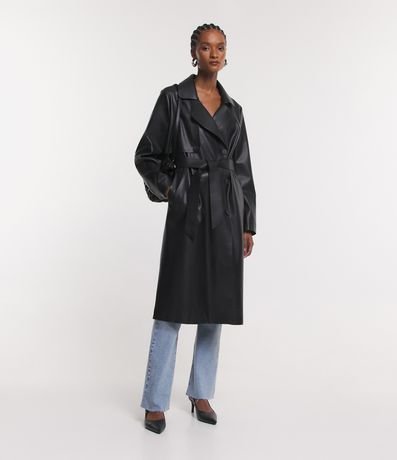 Ref: Casaco trench coat em material sintético, com gola lapela, abotoamento frontal, mangas longas e amarração na cintura.