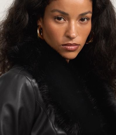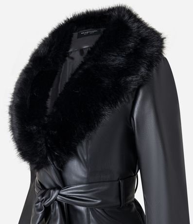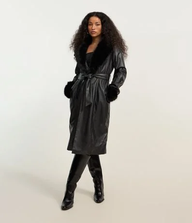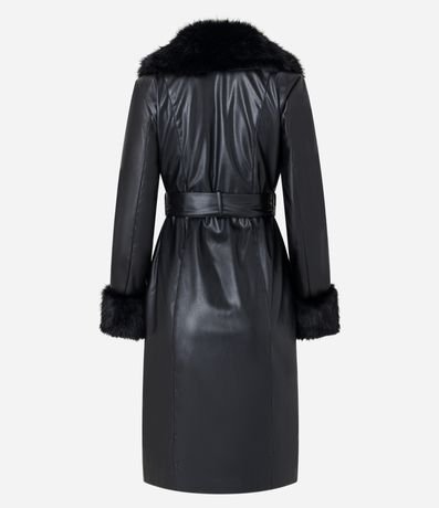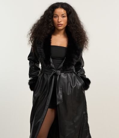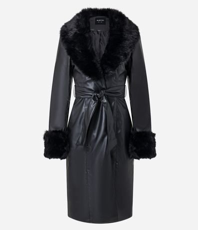 Casaco trench coat, alongado confeccionado em material sintético, pu, gola e punhos com pelinhos e cintura com passantes e faixa para amarração.