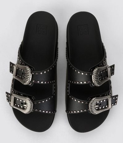 Ref: Chinelo feminino confeccionado em pvc com bico arredondado, sola média e duas tiras largas com detalhes de fivelas texturizadas e aviamentos contrastantes.