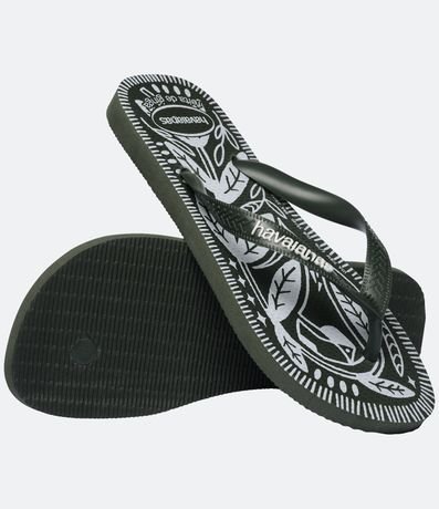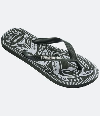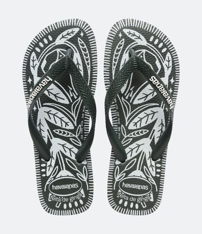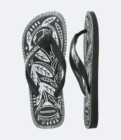 Ref: Chinelo de dedo, confeccionado em material sintético, com logo da marca na tira e estampa de folhagens.