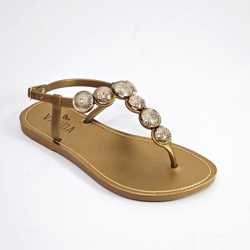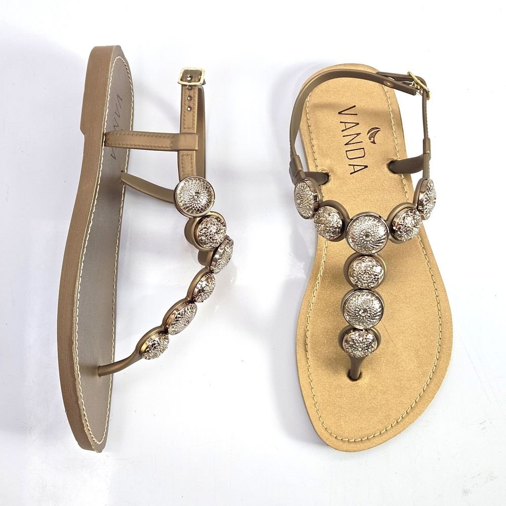 Adicione um toque de glamour e sofisticação aos seus pés com a Rasteira Feminina My Club Vanda, um modelo que combina o conforto casual com a elegância do acabamento em preto. Perfeita para quem busca um calçado que transita facilmente do dia para a noite, esta sandália tipo "dedo" destaca-se pela tira central exuberante, ricamente adornada com aplicações circulares que simulam pedrarias e strass, garantindo um brilho discreto e luxuoso a cada passo. Confeccionada em borracha com acabamento em tom bronze, ela é leve, possui fechamento por fivela ajustável no tornozelo para um ajuste seguro e uma palmilha que proporciona maciez e um caminhar agradável. É a escolha ideal para complementar looks de verão, festas casuais, passeios ou eventos que pedem um toque de brilho sem abrir mão da leveza e do bem-estar.Referência: SR2002