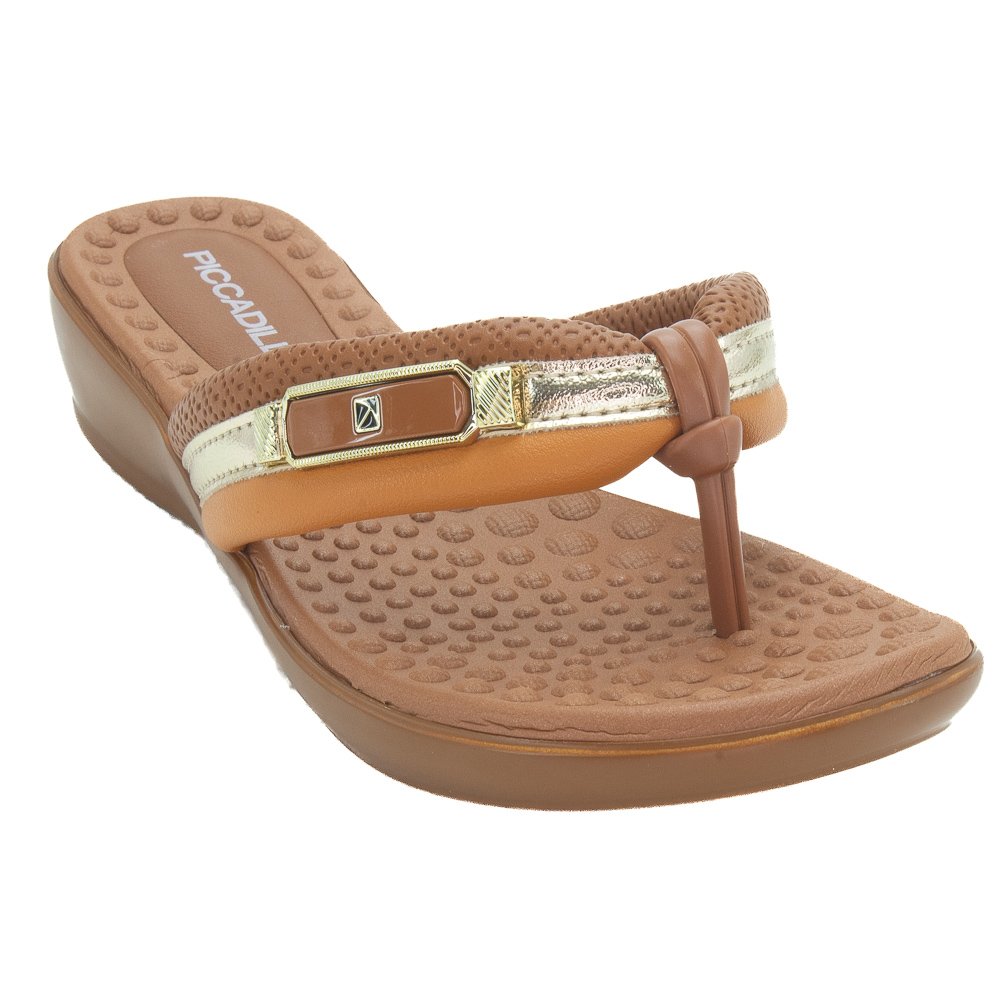 O Chinelo Feminino Piccadilly Salto Anabela é a peça essencial para mulheres que valorizam a união de elegância e bem-estar em um único calçado. Seu design moderno é apresentado em tons quentes de marrom/caramelo, que cobrem todo o calçado, conferindo um visual sofisticado e versátil. O modelo de dedo possui uma tira robusta e macia, que se destaca pela combinação de cores e texturas: o material principal em marrom (ou caramelo) é complementado por uma faixa em tom dourado metalizado e um detalhe decorativo elegante com a logo da marca em um aplique retangular. O chinelo é construído sobre um salto anabela médio na mesma cor marrom, garantindo uma elevação confortável e estável, perfeita para longos períodos de uso. A palmilha anatômica possui um design texturizado com pontos em relevo que proporcionam superconforto e ajudam a absorver impactos. A sola antiderrapante oferece segurança e aderência ao caminhar. Este chinelo é ideal para quem busca estilo sem abrir mão do conforto no dia a dia, permitindo transitar com leveza e elegância.
