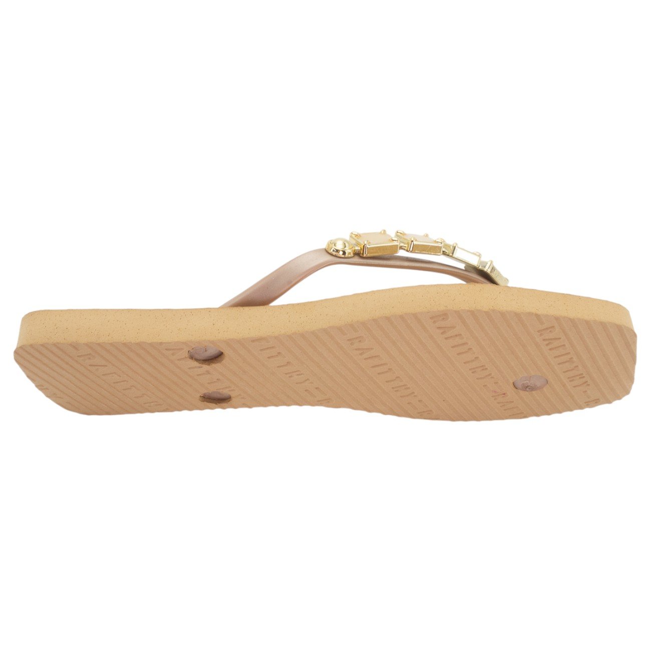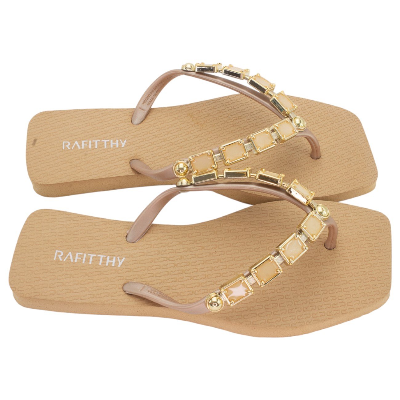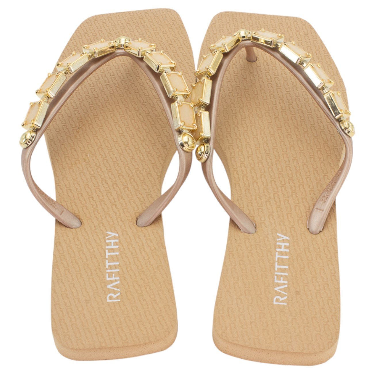 Ref: Chinelo Rafitthy na cor bege, apresentando um design elegante e quadrado. As tiras são adornadas com uma aplicação de pedras retangulares em tons claros e detalhes metálicos dourados, conferindo um toque sofisticado e glamouroso ao modelo. É ideal para quem busca conforto sem abrir mão do estilo.