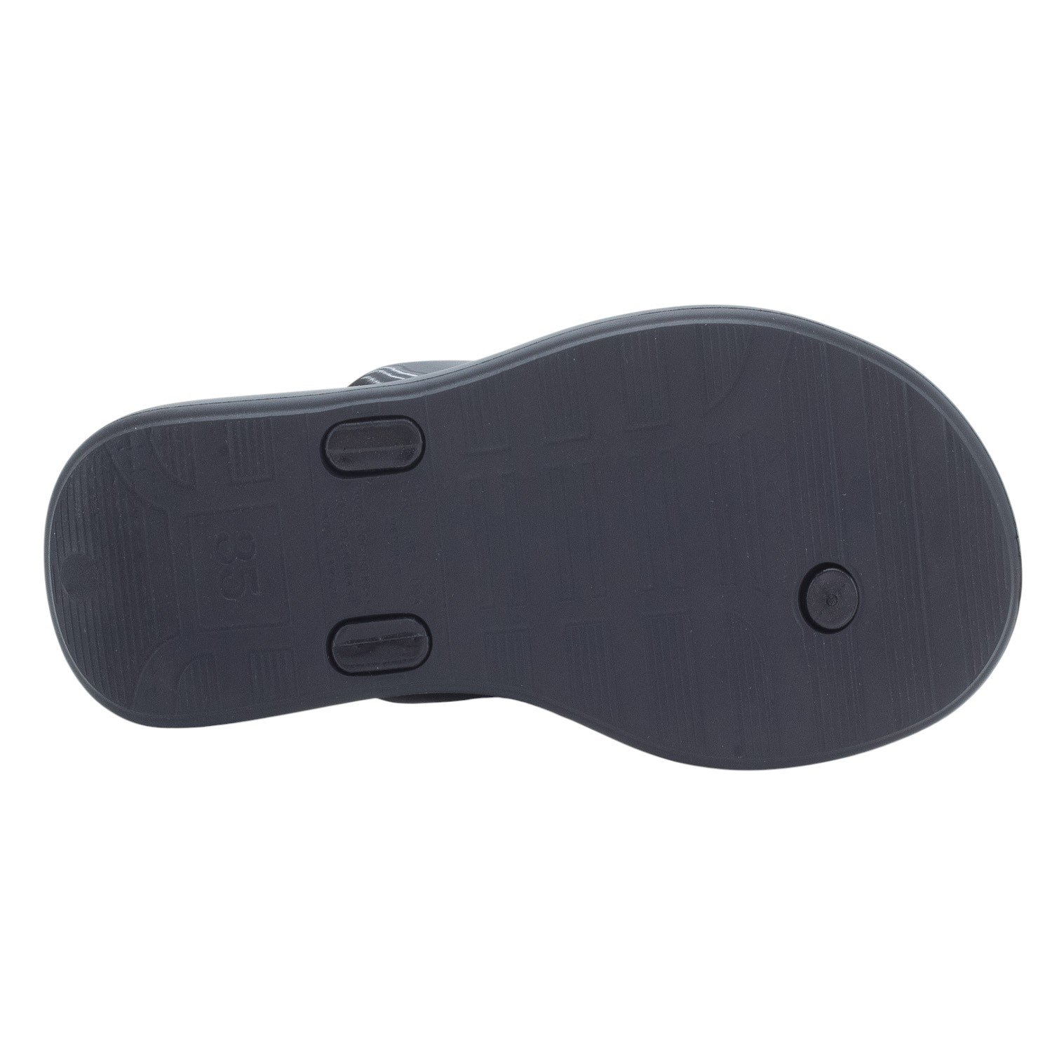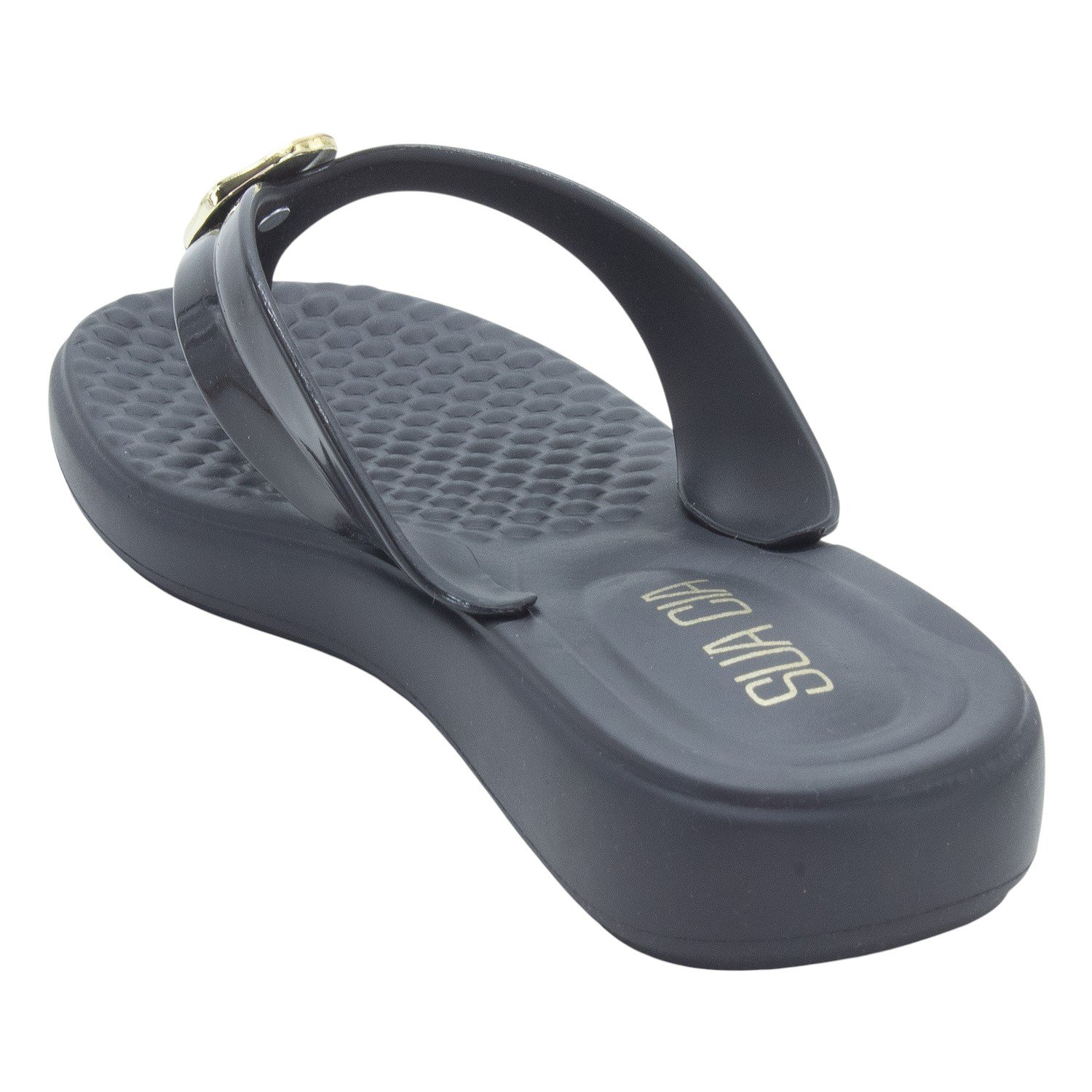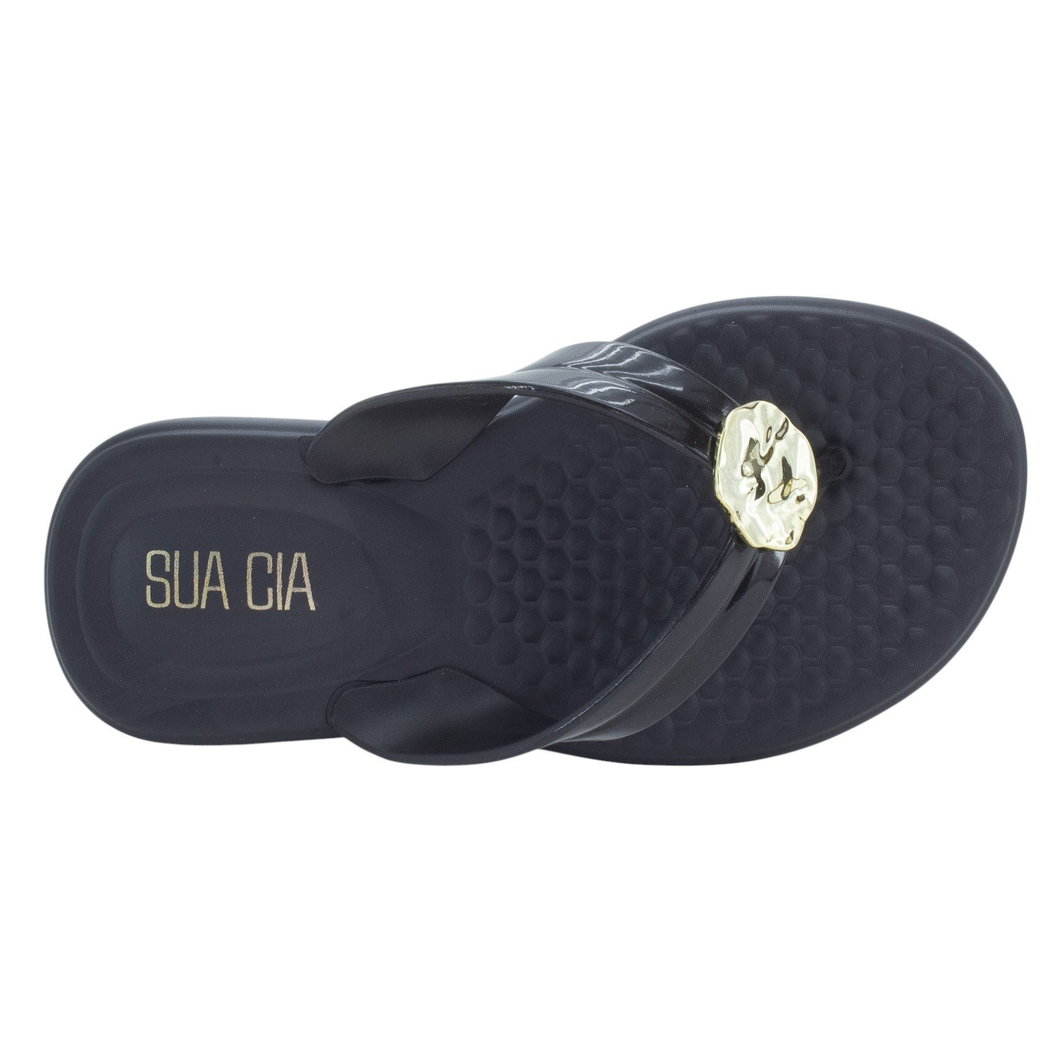 Ref: O Chinelo Feminino Sua Cia 8512.17023 na cor Preto é um calçado que alia praticidade e estilo para o dia a dia. Com um design moderno de dedo, similar a uma rasteira, ele se destaca pelo seu visual sofisticado na cor preta, que garante grande versatilidade para diversas combinações de looks. A principal característica de destaque é o aplique metálico em tom dourado, fixado na tira do dedo, que apresenta um formato orgânico e irregular, adicionando um toque de elegância e sofisticação ao calçado. O modelo é construído com material sintético leve e resistente, com o cabedal superior em acabamento brilhante. Para maior conforto, a palmilha, onde se lê a marca "SUA CIA" em dourado, possui uma textura em relevo de favo de mel na parte dianteira, sugerindo ser macia e antiderrapante. O solado, também preto, é mais robusto (plataforma sutil), proporcionando bom amortecimento e estabilidade, com ranhuras na parte inferior para garantir melhor aderência e segurança ao caminhar. É o calçado ideal para quem busca conforto sem abrir mão de um toque de modernidade.