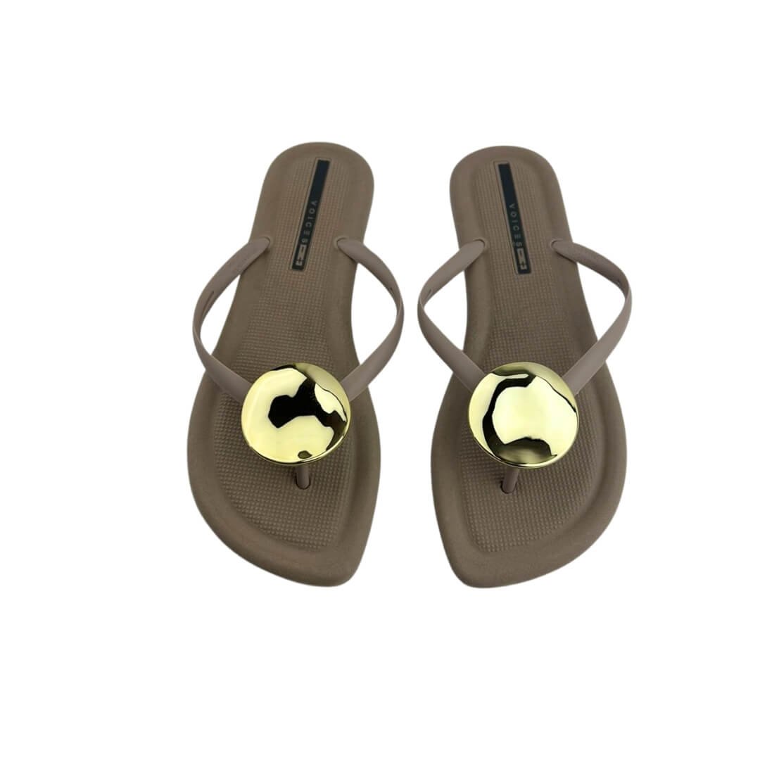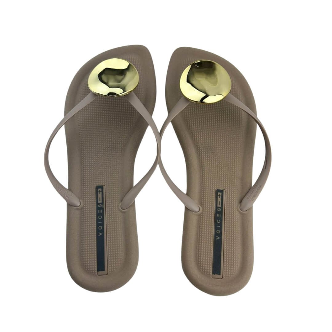 Ref: Conheça o Chinelo Feminino Voices 16.00002, a escolha perfeita para quem busca conforto e estilo no dia a dia. Com design moderno em tom neutro, ele se destaca pelo detalhe metálico dourado, que traz sofisticação mesmo nos momentos mais casuais. Ideal para usar na praia, piscina ou em passeios urbanos, este chinelo oferece leveza e ajuste confortável graças à sua palmilha texturizada que evita o escorregamento.