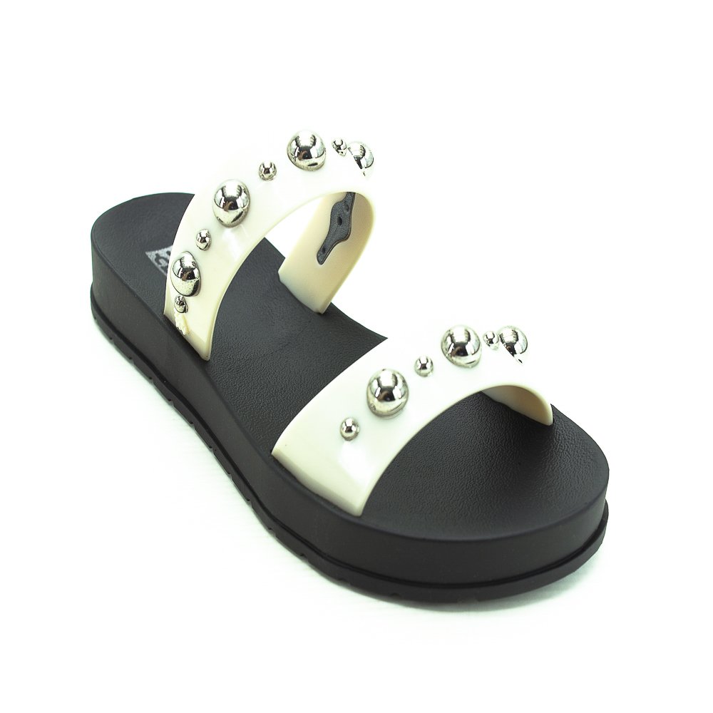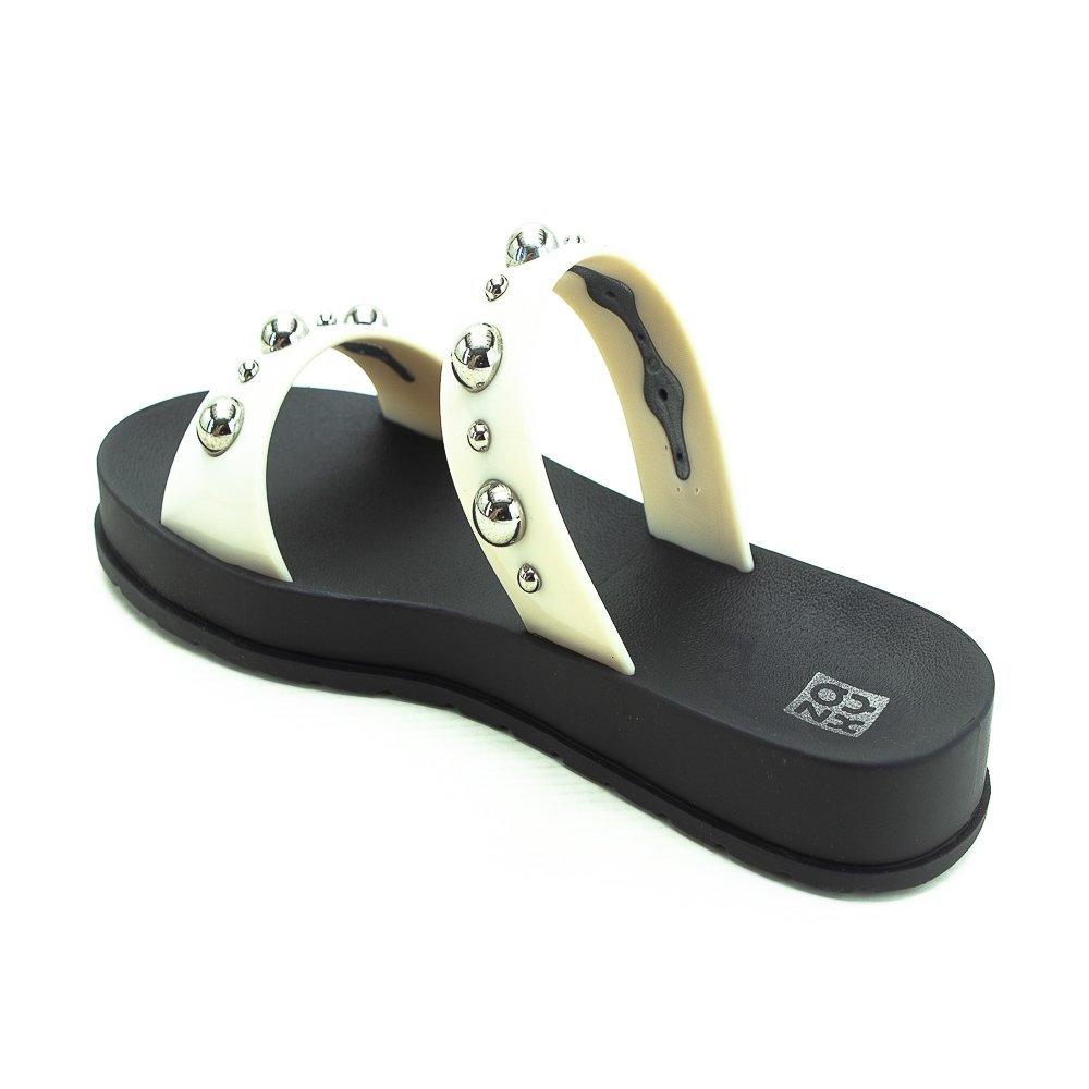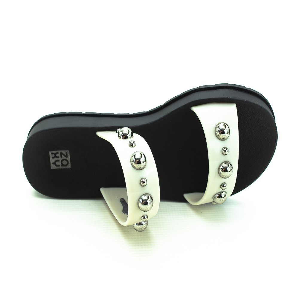 "Zaxy contém magia, moda, conexão e comunidade. Mulheres reais nos inspiram o tempo todo!" Chinelo slide feminino Modelo Zaxy Rise AD Tiras trabalhadas com spikes metalizados Emborrachado
