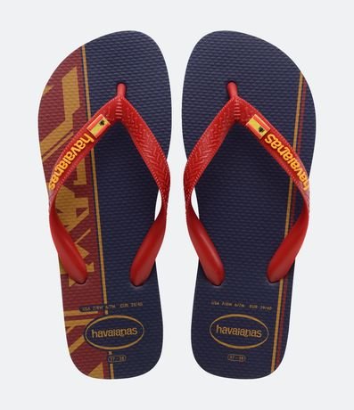 Ref: Chinelo masculino, modelo tradicional. Possui bico redondo, cabedal com tiras, com estampa Espanha e sem fechamento, com bandeira da Espanha.