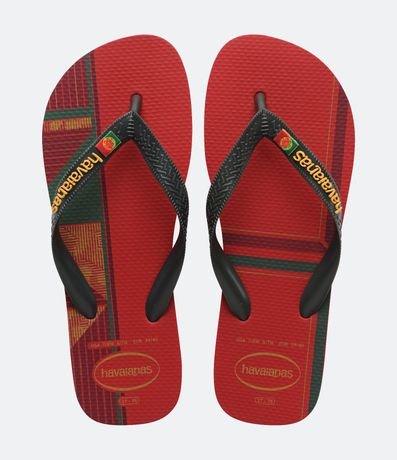 Ref: Chinelo masculino, modelo tradicional. Possui bico redondo, cabedal com tiras, com estampa de Portugal e sem fechamento, com bandeira de Portugal.