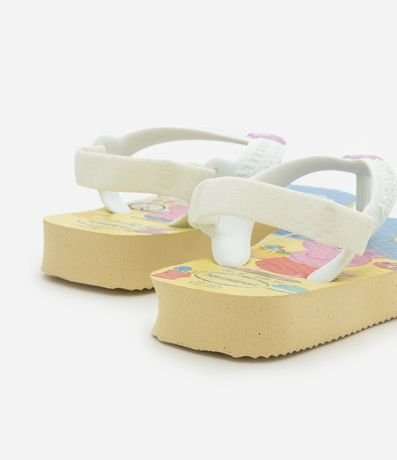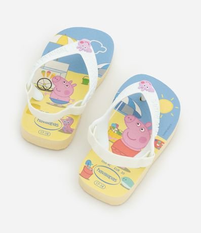 Ref: Chinelinho infantil para bebês, confeccionado em plástico e de modelo tradicional: com bico redondo e tiras normais. Possui estampa da personagem Peppa Pig e tira de sustentação no calcanhar.