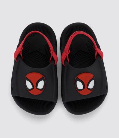 Ref: Chinelo infantil de modelo slide, com bico redondo, furinhos e elástico de sustentação. Possui patchs do Homem Aranha.