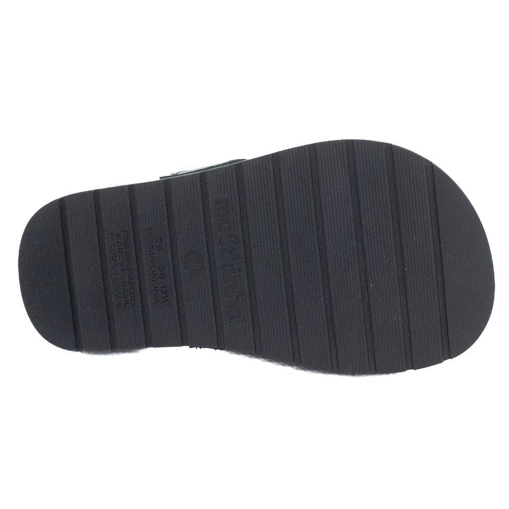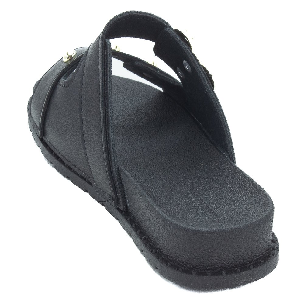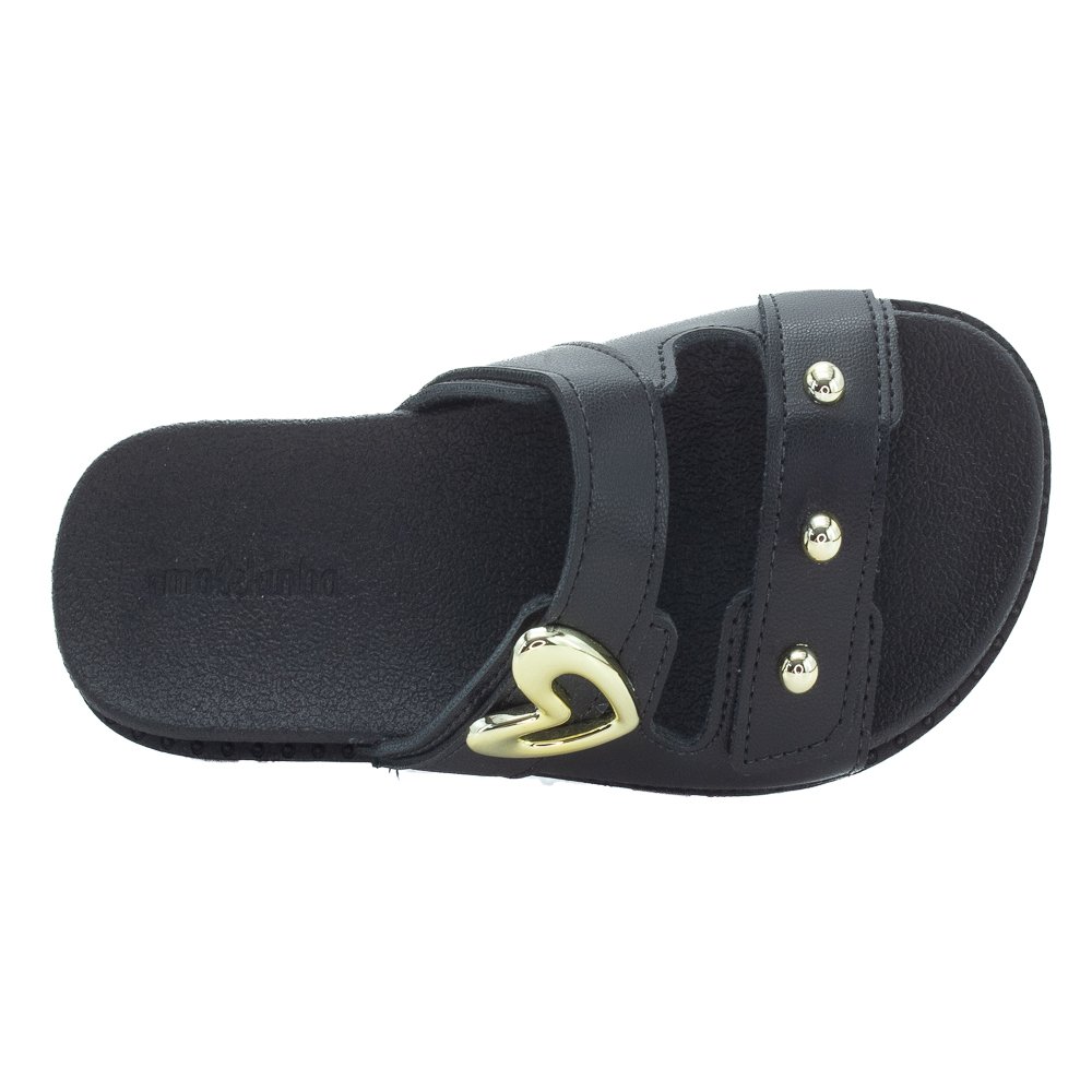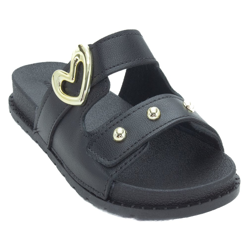 Ref: O Chinelo Infantil Slide Molekinha (Ref. 2341.127) é a escolha perfeita para meninas que amam a combinação de conforto, facilidade no calce e um estilo moderno com detalhes glam. Este calçado apresenta um design slide em um sofisticado preto total, tornando-o extremamente versátil. O cabedal é composto por duas tiras robustas em material sintético resistente. A primeira tira, superior e diagonal, é o destaque do modelo, ostentando um grande aplique metálico vazado em formato de coração na cor dourada. A segunda tira, mais estreita e reta, é adornada com três pequenas tachas douradas arredondadas, criando um contraste elegante e moderno com o fundo preto. Com calce fácil e sem fechamentos complexos, ele é ideal para o uso diário, passeios e momentos casuais. O solado tipo papete rasteira (flat) é confeccionado em sintético antiderrapante, garantindo leveza, flexibilidade e segurança a cada passo. A palmilha e a sola são pretas e a palmilha lisa proporciona conforto extra. Este chinelo é perfeito para adicionar um toque de estilo e personalidade ao look das meninas, unindo a praticidade do slide com a tendência dos apliques dourados.