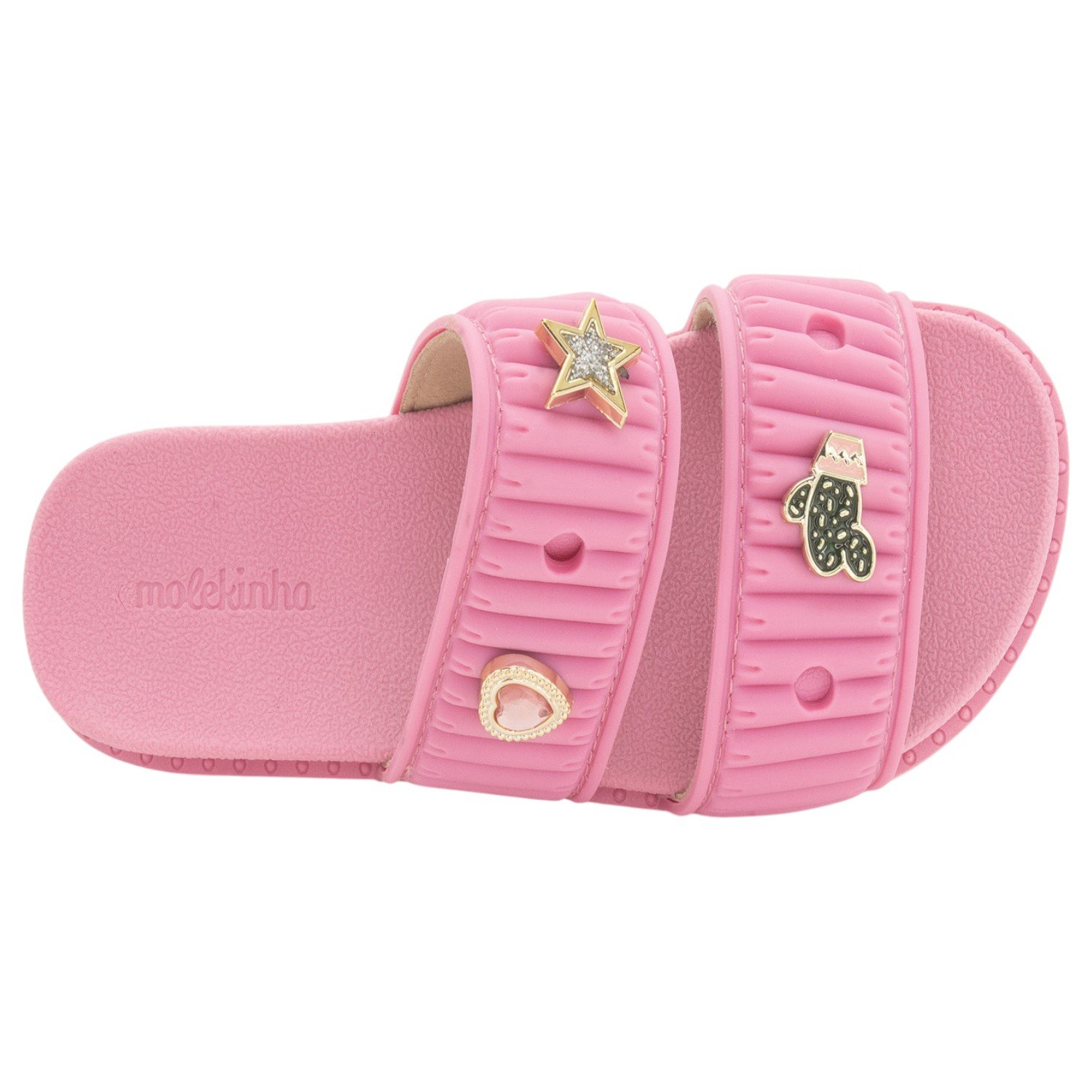 O Chinelo Infantil Molekinha 2341.138 é a escolha ideal para meninas que buscam conforto, praticidade e um toque de charme em cada passo, sendo um modelo leve e flexível em um tom de rosa vibrante e alegre. O cabedal é composto por duas tiras no estilo slide, que apresentam um design franzido ou plissado em alto relevo, conferindo um visual moderno e super feminino. O grande destaque fica por conta dos três charmosos adornos metalizados fixados nas tiras, que adicionam um toque de brilho: uma estrela com glitter, um coração com pedra brilhante/strass e um cacto. A palmilha possui a marca "Molekinha" em relevo, e o solado robusto e flexível com ranhuras horizontais garante segurança e estabilidade em diferentes superfícies. Graças ao seu formato slide de calce fácil, este chinelo é perfeito para a rotina das crianças, combinando com diversos looks e sendo ideal para praia, piscina, passeios e uso diário, tornando-se um item indispensável no guarda-roupa infantil.