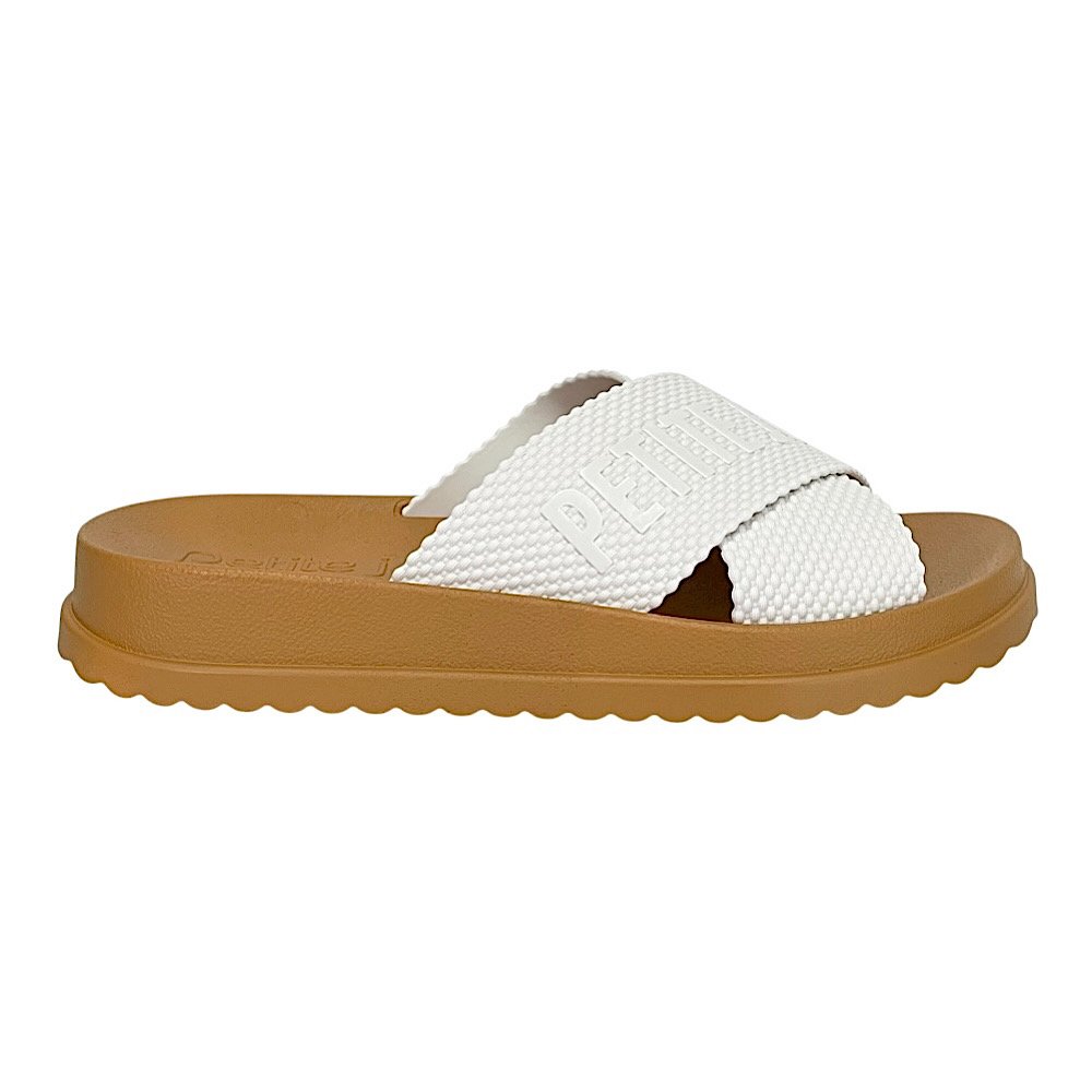 Ref: Charmoso e moderno, o Tamanco Petite Jolie Flat Smash White/Doce de Leite combina o frescor do branco com o toque aconchegante do caramelo em um design que exala estilo. Suas tiras cruzadas em J-Soft garantem conforto e flexibilidade, enquanto o logo da marca traz um detalhe imponente e sofisticado. O contraste de cores realça o design flatform, que entrega estabilidade e visual urbano. Perfeito para produções leves e contemporâneas, é o modelo ideal para quem busca autenticidade e bem-estar em um só calçado.
