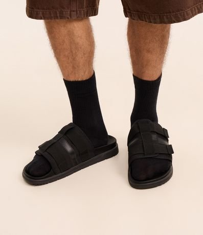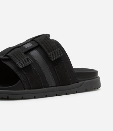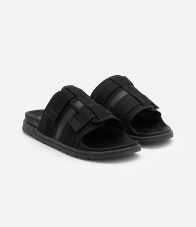 Ref: Chinelo slide, confeccionada em material sintético, possui fechamento por velcro e bico redondo.