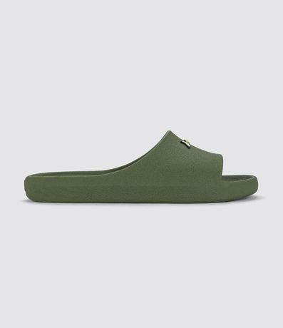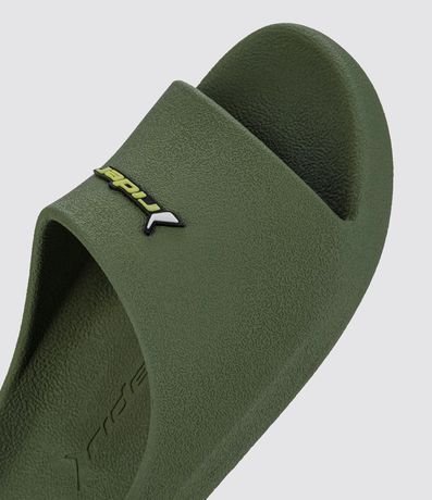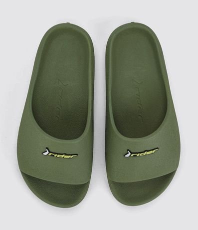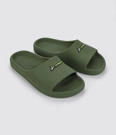 Chinelo masculino confeccionado em PVC, de modelo slide e com etiqueta da marca Rider aplicada.