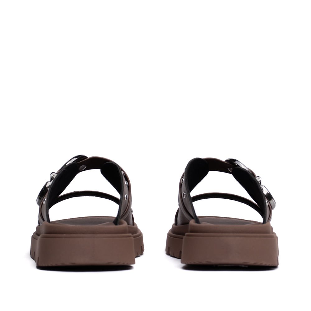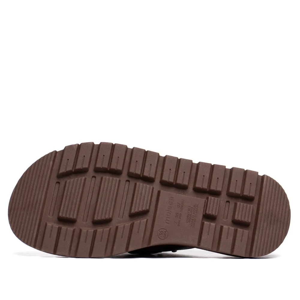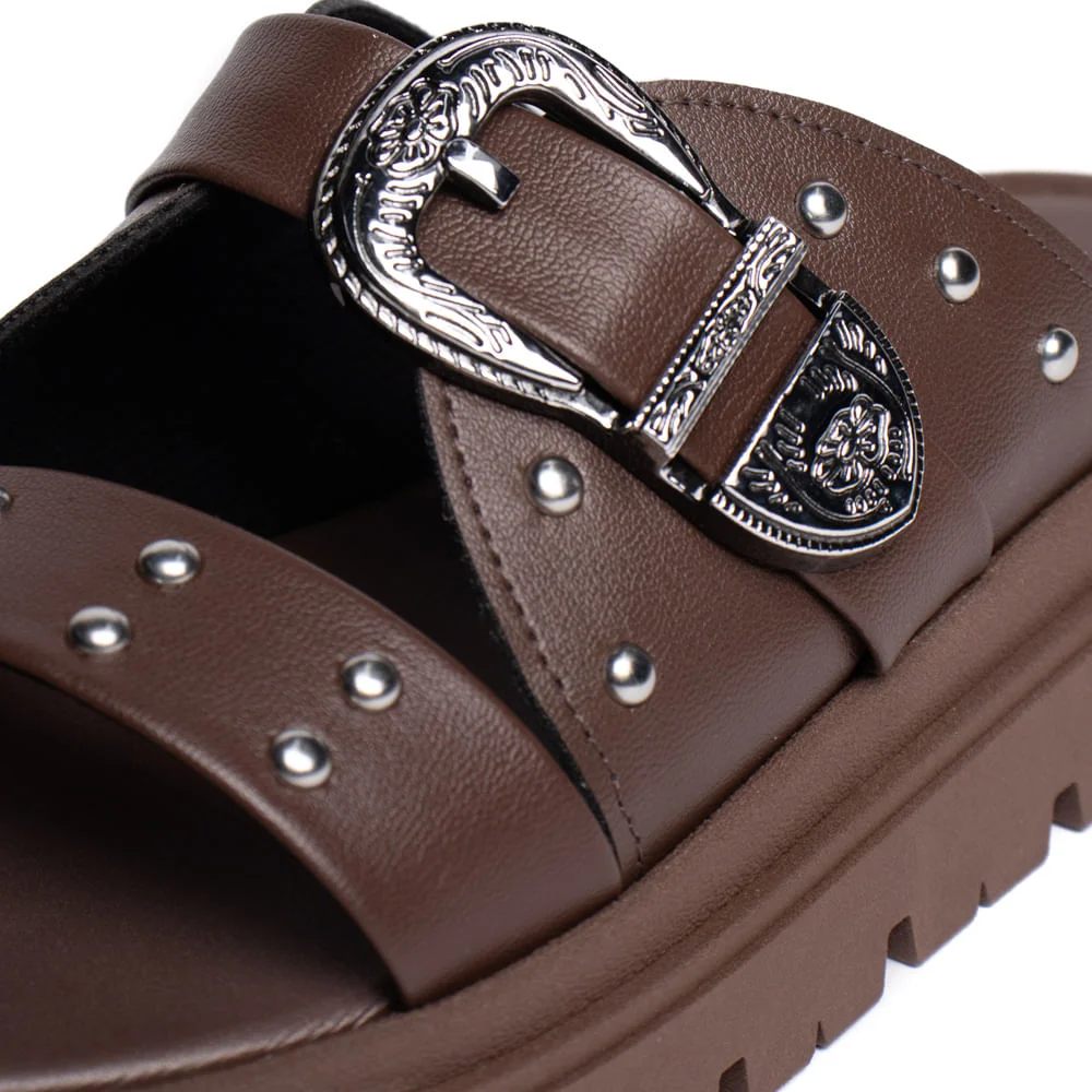 Ref: O cabedal em napa garante maciez ao toque e maior durabilidade, enquanto as tiras largas com fivelas proporcionam firmeza e um calce personalizado. A cor marrom adiciona sofisticação e combina facilmente com diferentes produções.