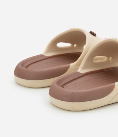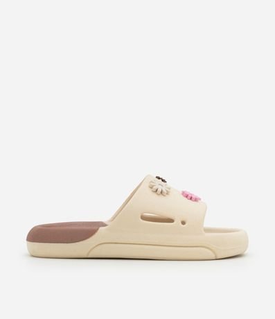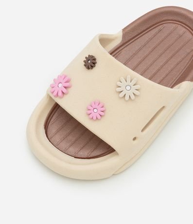 Ref: Chinelo infantil de modelinho slide, com tira larga, solado reto, bico redondo e florzinhas aplicadas na parte superior.