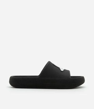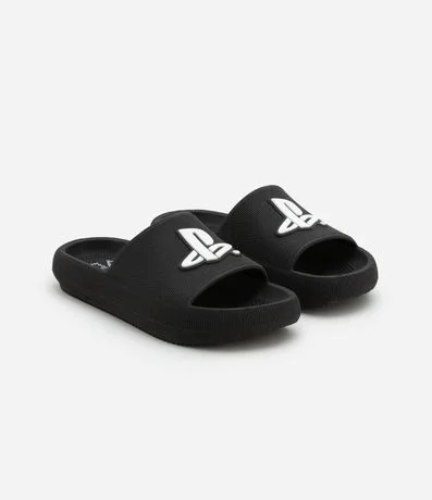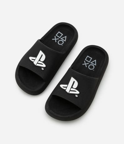 Chinelo infantil confeccionado em pvc mais sustentável, de modelo slide, com bico redondo, solado comfy e detalhe Playstation.