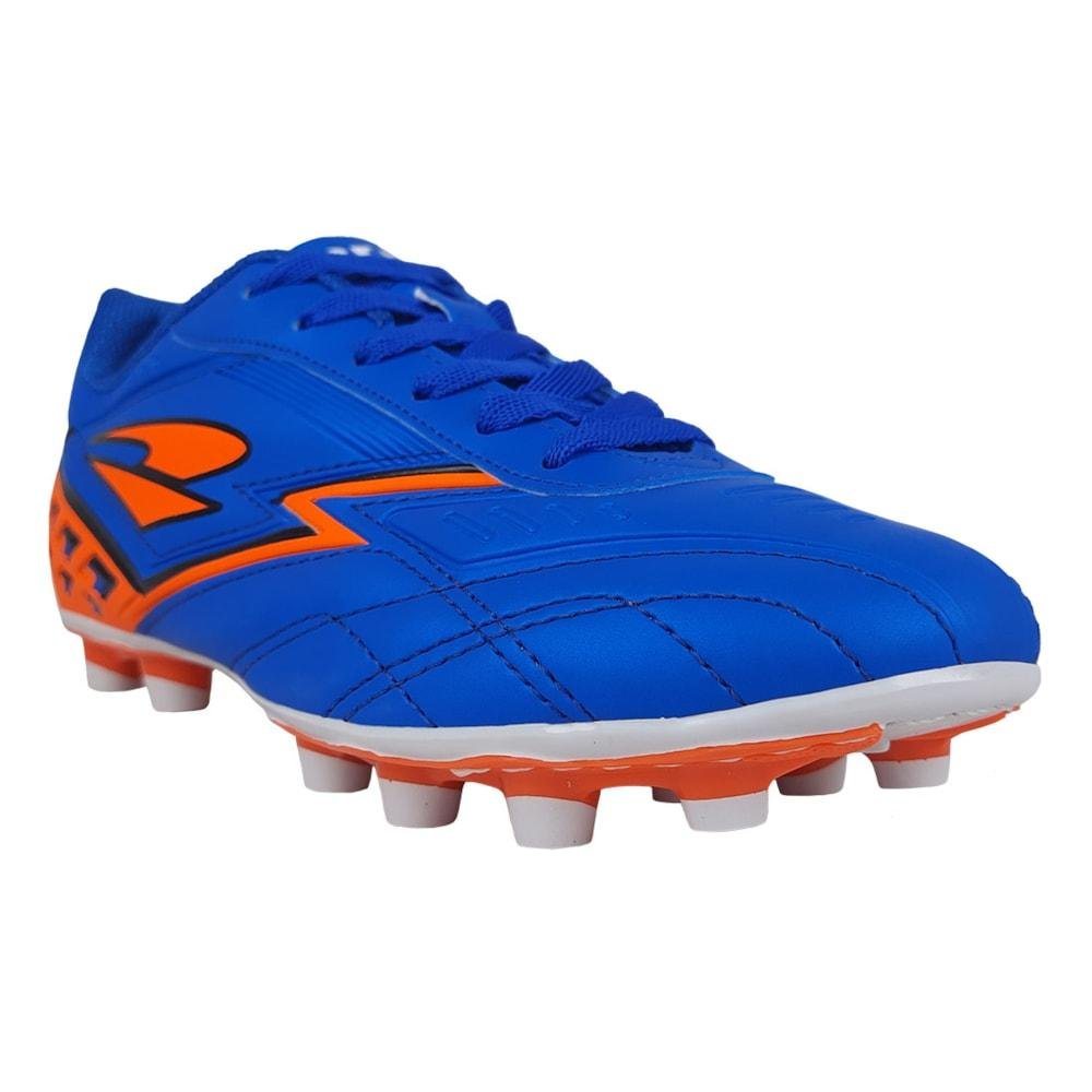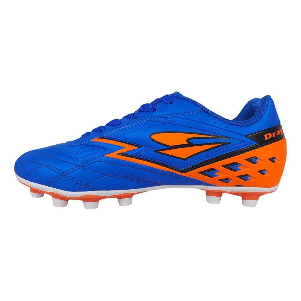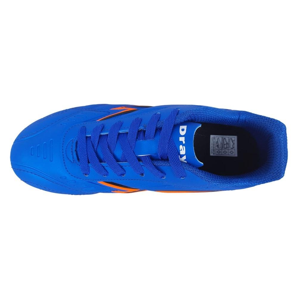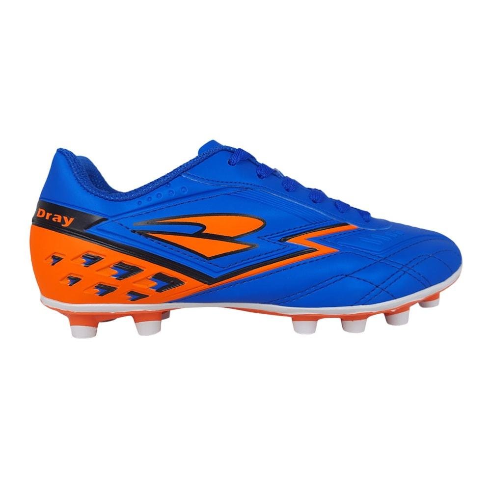 Ref: A Chuteira de Campo Dray Topfly 396 Unissex é um produto conhecido no mercado pela qualidade e preço baixo, sendo mais acessível a todos. Produto é elaborado com cabedal em material sintético e PVC laminado, além de ter a palmilha em PU que garante maior conforto, e o solado em borracha com travas fixas que traz maior segurança para o futebol de campo. Modelo: Topfly 396;Cor: Azul/Laranja;Gênero: Unissex;Marca: Dray;Composição: Cabedal em material sintético laminado, solado em borracha;