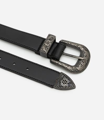Cinto masculino confeccionado em poliuretano e seguindo boas práticas ambientais. O acessório tem fivela e ponteira estilo western/country.