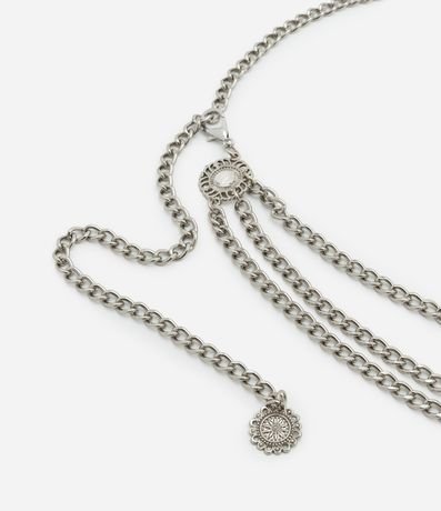 Ref: Cinto corrente estreito, confeccionado em metal, com fechamento por lagosta. Acessório com pingentes de medalhas.