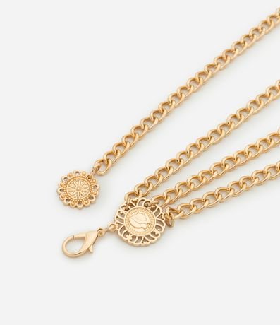 Cinto corrente estreito, confeccionado em metal, com fechamento por lagosta. Acessório com pingentes de medalhas.