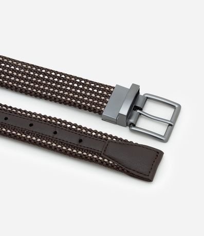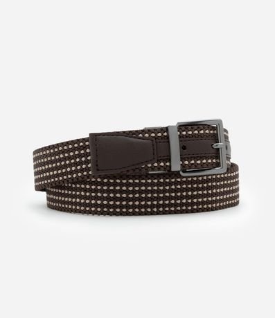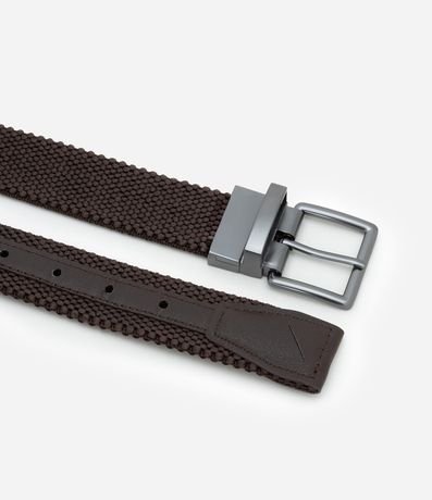 Ref: Cinto masculino em elástico no modelo reversível, possui detalhe contrastante em um dos lado e padronagem lisa do outro lado e fivela quadrada.