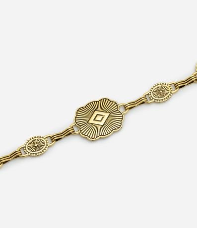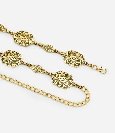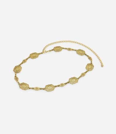 Ref: Cinto feminino confeccionado em metal, com textura de moedas trabalhadas e corrente. Possui fechamento por fecho lagosta.