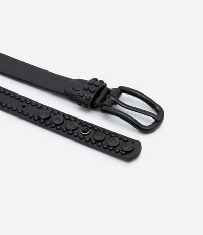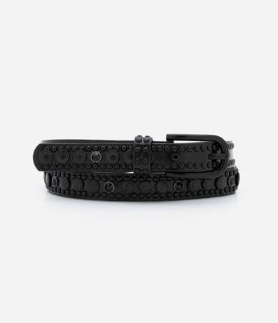 Ref: Cinto feminino estreito com fivela diferenciada, passante e com aplicação de tachas ao longo de toda a peça.