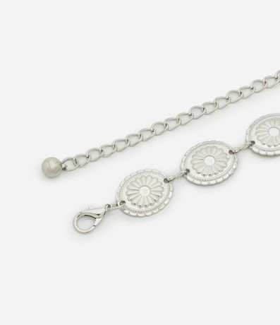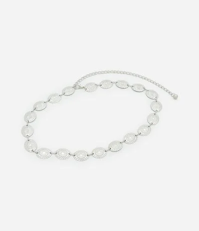 Ref: Cinto feminino estreito em metal com elos de esferas com texturas e fechamento por lagosta.