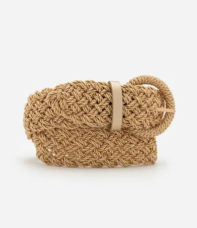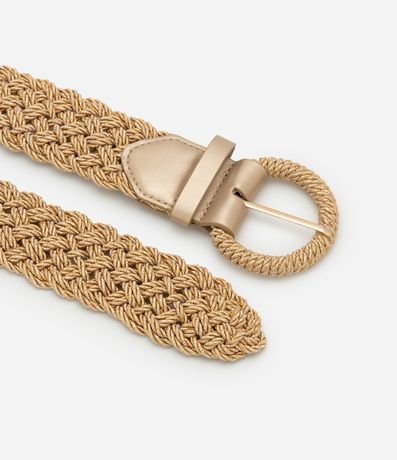 Ref: Cinto largo com fios metalizados trançados e fivela de argola forrada.