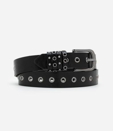 Ref: Cinto feminino confeccionado em material sintético no modelo médio com fivela arredondada e detalhes contrastantes de ilhós e metais.