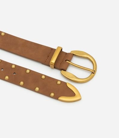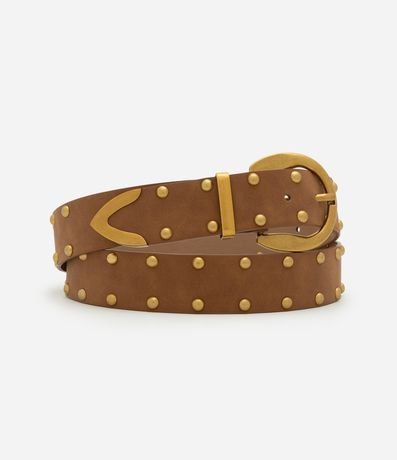Ref: Cinto médio confeccionado em material sintético. O acessório tem rebites, passantes, fivela e ponteira de metal.
