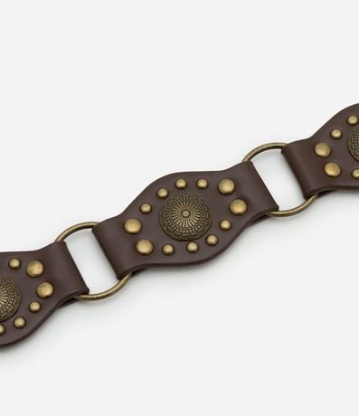 Ref: Cinto médio confeccionado em material sintético intercalado por argolas. A peça tem rebites, dando um estilo boho e western.