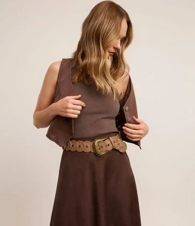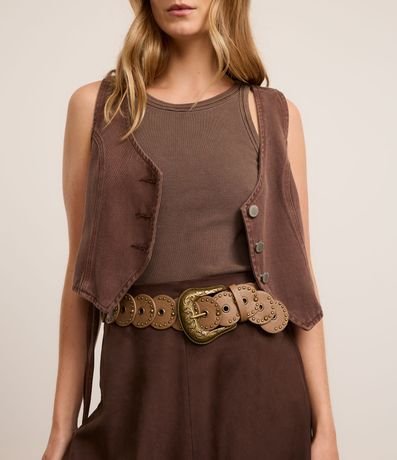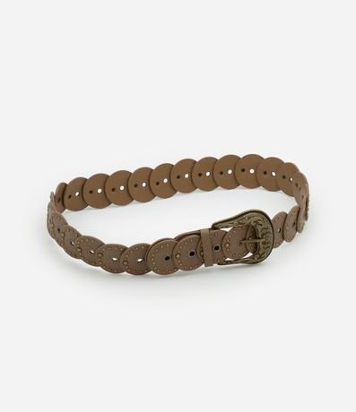 Cnto médio confeccionado em material sintético, pu, em formato de bolinhas com tachas aplicadas e fivela western em metal.