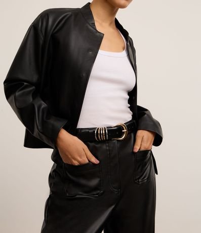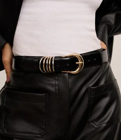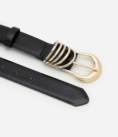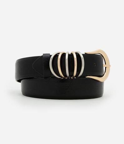 Ref: Cinto feminino confeccionado em material sintético. Peça com fivela redonda e detalhe mix de argolas bicolors.