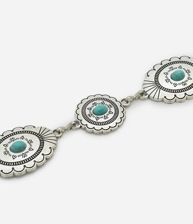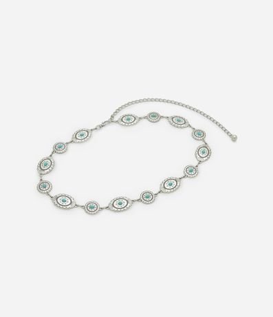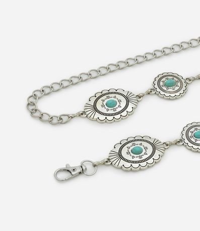 Ref: Cinto feminino de metal com correntes e placas decoradas no estilo brasão e fechamento por lagosta.